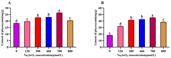 Effect of Na2SeO3 on the content of C-PC of A. platensis. (A) One-time addition; (B) batch additions. Note: data with different lowercase letters in the legend indicate significant differences (p < 0.05).