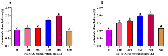 Effect of Na2SeO3 on the content of chlorophyll a of A. platensis. (A) One-time addition; (B) batch additions. Note: data with different lowercase letters in the legend indicate significant differences (p < 0.05).