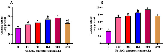 Effect of Na2SeO3 on the catalase activity of A. platensis. (A) One-time addition; (B) batch addition. Note: data with different lowercase letters in the legend indicate significant differences (p < 0.05).