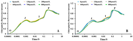 Effect of different Na2SeO3 concentrations on the chlorophyll a fluorescence induction kinetic curves of A. platensis. (A) One-time addition; (B) batch addition.