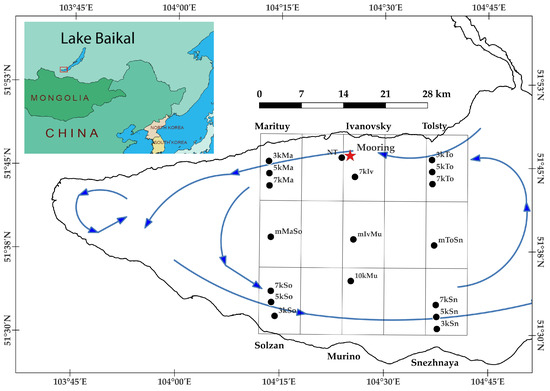 Location of study area (red rectangle in the inset) and scheme of measurement stations in Southern Baikal: dots—CTD stations, star—mooring, grid—area of ERA5-Land reanalysis data used for meteorological forcing. Blue arrows—mean currents pattern in study area.