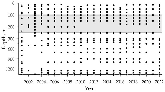Sensors were placed throughout the depth of the lake ranging from 4 m above the bottom to 11–43 m below the lake surface. Depths varied slightly from year to year, with the highest concentration of sensors in the active layer (down to 250 m) and near-bottom zone (see Figure 2). Additionally, about three to seven thermal sensors were installed in the MTML occurrence area in different years.