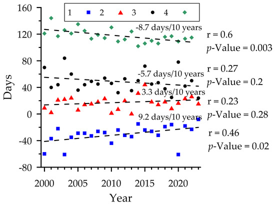 Number of days relative to 1 January (taken as zero) and duration of hydrological events during the observation period, and their trends: 1—number of the day when temperature at the upper sensor of the mooring crossed 4 degrees, 2—number of the day when ice-on occurs, 3—duration of the fall cooling period, 4—number of the day when ice-off occurred.