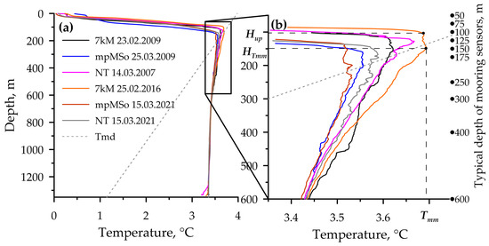 Below the ice cover, water temperature in Lake Baikal exhibits a distinct thermal stratification. Directly under the ice, the temperature in the first meter experiences a sharp jump from 0 to 0.05–0.5 . Then, there is a relatively mixed layer of radiatively driven convection, whose thickness gradually increases in spring with the raising of incoming solar radiation (from meters to tens meters). Afterwards water temperature rises uniformly and quickly (thermocline layer), reaching its maximum value at depth in MTML. The lower boundary of the thermocline is the upper boundary of the mesothermal maximum layer, whose temperature lies in the range of 3.5–3.7 (Figure 4b). The MTML layer can be as small as 10–20 m or reach thicknesses of more than 150 m. Below the MTML, the temperature drops gently to 3.36 in South Baikal. Deeper than 700 m, interannual temperature differences usually do not exceed 0.02 , and only in the near-bottom 100 m region, temperature deviations up to tenths of a degrees are possible, indicating the processes of deep water renewal.