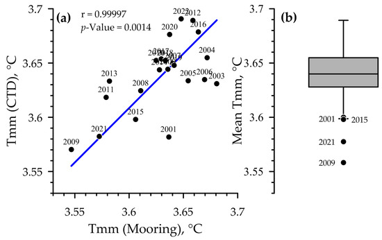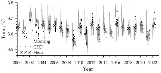 It can be seen that the variations during individual winters by water area (CTD data) and by time (mooring data) are approximately of the same order. According to CTD data, ranged within 3.527–3.747 (mean 3.638 ), its depth varied from 104 to 230 m (mean 149 m), and the upper boundary of the MTML ranged within 94–184 m (mean 132 m). According to the data in Figure 5, the average winter values were calculated. Figure 6a shows a comparison of spatial and temporal averaging of . Despite the high correlation coefficient between the various averages, the difference between them in some years can reach 0.05 . Therefore, it was decided to take the average of the combined CTD and mooring data as the mean winter temperature (the result of the combined average is shown by crosses in Figure 5).