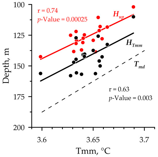 An analysis of the mean winter depths of the upper boundary of MTML and the depths of maximum temperature as a function of (Figure 7) indicates that decrease in maximal temperature in MTML is accompanied by deepening of its depth and upper boundary of MTML. Thus, this behavior is consistent with the dependence of temperature of maximum density on depth.