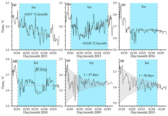Examples of variations in temperature during winter in different years (a–f); blue areas indicate ice-covered periods.