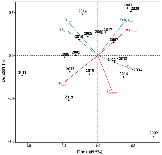 All analyzed parameters characterizing the years under study were divided into two groups: the dependent variables , , , and and the responsible factors , , , and . The assessment of the reliability of the relationship between dependent variables and responsible factors was carried out using the Mantel test [34] based on matrices of pairwise Euclidean distances and Pearson’s correlation coefficient. The reliability of the value of the correlation coefficient is determined by a permutation test (5000 permutations), the relationship was considered significant at . The analysis was carried out in the “vegan” [35] package for the R programming language. Visualization of multivariate data for years characterized by dependent variables and responsible factors was carried out using the principal component analysis (PCA) method. Before using PCA to level the influence of dimensionality, the data for each variable were normalized by ranging from 0 to 1. The analysis included responsible factors that showed a significant relationship with dependent variables according to the results of the Mantel test. The analysis was carried out using the packages “vegan” [35] and “factoextra” [36] for the R programming language.