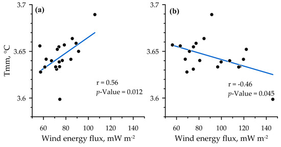 A positive relationship between and cumulative wind energy flux during summer and a negative one in the period of late-autumn cooling is well traced. Both dependencies can be considered reliable (p < 0.05), and it can also be concluded that the relationship with summer winds is slightly higher than with winds in late fall (Figure 10).