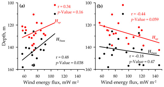 Comparison of the depth of the upper boundary of MTML (, red circles and trend lines) and the depth of maximum temperature (, black circles and trend lines) on wind energy during (a) summer and (b) late autumn periods for all years of measurements.