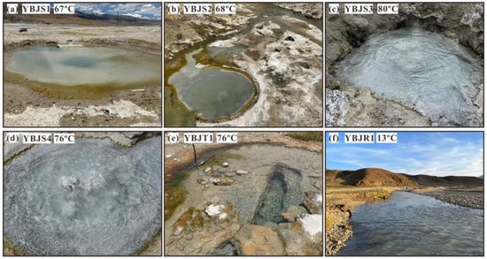 Photographs of geothermal water and river on site. (a) YBJS1, (b) YBJS2, (c) YBJS3, (d) YBJS4, (e) YBJT1, and (f) YBJR1. The temperatures marked in the figure were the exposure temperature of the site.