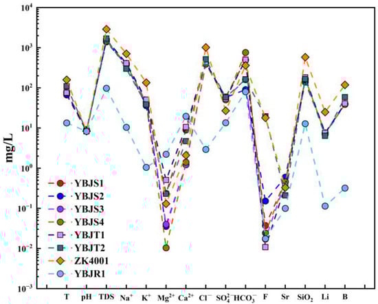 The collected samples were sent to Kehui Testing (Tianjin) Technology Co., Ltd. for hydrochemical and D-O-Sr isotope analyses. Major cations (K+, Na+, Ca2+, and Mg2+) were analyzed via inductively coupled plasma emission spectrometry (ICP-OES), while anions (Cl−, SO42−, and F−) were analyzed via ion chromatography (Diona ICS-1100). Silicon and other trace elements were detected by ICP-MS (7000C, Agilent). The ion charge balance was calculated to be less than ±10% for most samples (Table 1). Hydrogen and oxygen isotopes (δD and δ18O) were measured using the water balance hydroxide isotope analysis method (MAT251EM). The obtained data were subsequently standardized to Vienna Standard Mean Ocean Water (VSMOW) using the conventional δ (‰) expression. The accuracy of the detection of δD and δ18O was ±0.5% and ±0.1%, respectively. Strontium isotopes (87Sr/86Sr) were tested via MC-ICP-MS using NIST SRM 987 Sr isotope standards as standards. In addition, this study also cited the sample data (YBJT2 and ZK4001) studied by references [24,25].