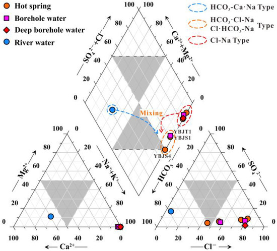 The Piper trilinear diagram showed that the hydrochemical types of geothermal water samples were predominantly of the Cl-Na, Cl·HCO3-Na, and HCO3·Cl-Na types (Table 1 and Figure 4). The hydrochemical type might be attributed to the reservoir lithology of the geothermal field being granite and sandstone (rich in silicate minerals) [34]. Interestingly, the process of mixing hot and cold water was indicated: Cl-Na-type water (deep reservoir) and HCO3-Ca·Na-type water (shallow cold water) were mixed to form Cl-HCO3·Na and HCO3-Cl·Na-type water (shallow reservoir) (Figure 4). The shallow reservoir in Yangbajing was formed due to the upward flow of geothermal fluids from the deep reservoir into the Quaternary aquifer [24].
