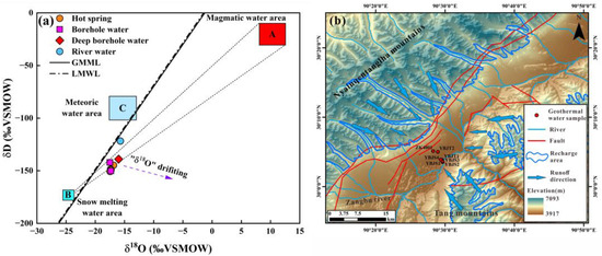 Due to the “δ18O” drift phenomenon, δD was more suitable for estimating the recharge elevation of geothermal water. According to the elevation gradient of δD on the Tibetan Plateau (–2.6%/100 m, [49]), the recharge elevations estimated by Equation (3) were between 5008 m and 5458 m (Table 1). In the study area, the Nyainqentanglh Mountains in the northwest and the Tangshan Mountains in the southeast were the recharge areas of geothermal water (Figure 5b). Based on the temperature effect of stable hydrogen isotopes (Equation (4)) [40], the recharge temperature of the geothermal water ranged from −20 °C to −16 °C.