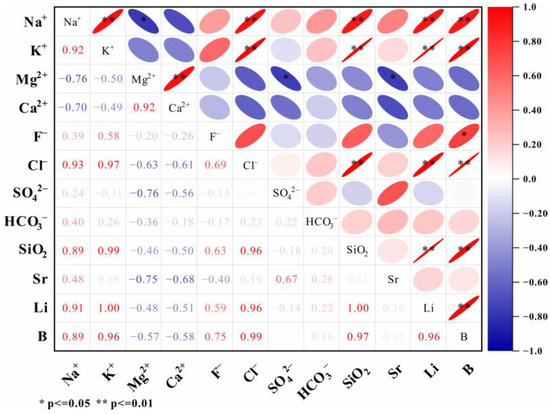 In this study, Pearson correlation analysis was performed to understand the correlation characteristics among the hydrochemical variables. As shown in Figure 6, the correlation between Cl−, Na+, K+, SiO2, Li, and B was very positive, with the correlation coefficients higher than 0.85, indicating that these variables might have the same source. However, Mg2+ and Ca2+ were negatively correlated with other ions, suggesting that there were other factors influencing the changes in Mg2+ and Ca2+ concentrations.