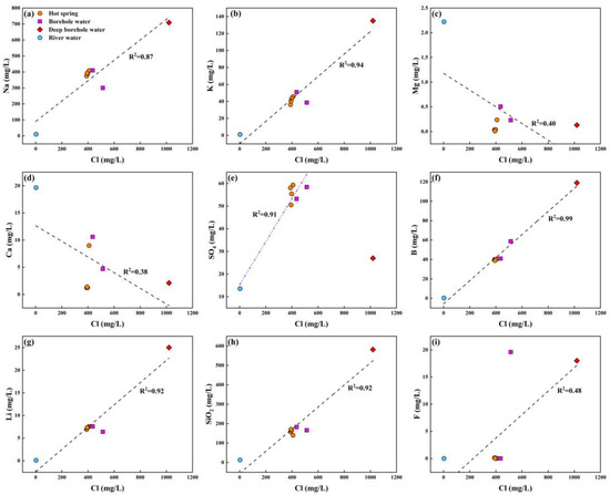 Relationship between Cl and hydrochemical parameters. (a) Na, (b) K, (c) Mg, (d) Ca, (e) SO4, (f) B, (g) Li, (h) SiO2, and (i) F. The black dotted line is the fitting line of all samples; the purple double-dotted line is the fitting line to remove the deep borehole water (ZK4001). The method used for fitting is divided into the least squares method.