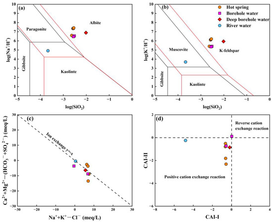 Moreover, ratio plots of (Na+ + K+ − Cl−) and (Ca2+ + Mg2+) − (SO42− + HCO3−) can illustrate the effect of ion exchange on groundwater [56]. Schoeller indices CAI-I (=(Cl− − (Na+ + K+))/Cl−) and CAI-II (=(Cl− − (Na+ + K+))/(HCO3− + SO42− + CO32− + NO3−)) can further confirm the type of cation exchange [57]. The geothermal samples were distributed near the ion exchange line, and the CAI-I and CAI-II values were below zero (Figure 8c,d). This signifies that positive ion exchange occurred, i.e., Ca2+ in the geothermal water was replaced by Na+ in the granite.