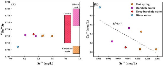 The initial abundance of strontium isotopes (87Sr/86Sr) varies widely between rock types and can serve as a conservative tracer of water–rock interactions [58]. Previous studies showed that the 87Sr/86Sr ratios of silicate rocks in the Yangtze River Basin of China are typically >0.715 [59]. The 87Sr/86Sr ratios in marine carbonate rocks range from 0.707 to 0.709 [60]. In addition, the 87Sr/86Sr ratios in granites from the Yangbajing geothermal field in the study area were 0.710 to 0.718 [30]. The 87Sr/86Sr ratios of geothermal water consistently aligned with those of granite (Figure 9a), suggesting that the predominant source of strontium was the granite reservoir. The river water was located in the range of carbonate rocks, which could be related to the dissolution of carbonate rocks (Figure 1b). In addition, the negative correlation between Sr2+ and Ca2+ in geothermal water also confirmed that Sr2+ did not come from the dissolution of carbonate minerals (Figure 9b). Geothermal water leaches Sr2+ from silicate minerals during water–rock interactions, leading to an increase in Sr2+ concentration in geothermal water [61].