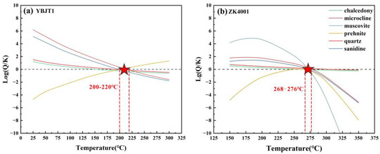 Results of estimation of shallow (a) and deep (b) geothermal reservoir temperatures via multivariate mineral–water equilibrium thermometers. The red star in the figure represents the position and corresponding temperature when the mineral group reaches equilibrium.