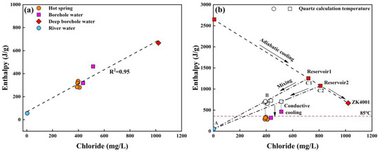 (a) The fitting relationship between chloride and enthalpy of Yangbajing water sample. (b) Chlorine–enthalpy diagram of Yangbajing water sample. The relationship between enthalpy and temperature is as follows: enthalpy = temperature × 4.1868; the unit is J/g.