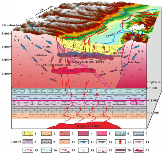 Conceptual model of genesis of Yangbajing geothermal system. The numbers in the figure are as follows: 1. Pleistocene glacial deposits in the Quaternary; 2. Paleogene Eocene Pana Formation trachyte and ignimbrite.; 3. Miocene Jieli medium–fine-grained biotite monzonitic granite; 4. fine-grained biotite monzonitic granite in the Eocene Yangbajingbingzhan; 5. granitic mylonite belt; 6. granitic gneiss; 7. gneiss; 8. granoamphibolite; 9. maritime carbonate rocks; 10. migmatite; 11. rainfall and snow melt infiltration recharge; 12. heating groundwater; 13. geothermal fluid rise; 14. geothermal fluid lateral flow; 15. deep-layer volatiles; 16. rivers; 17. normal fault; 18. joints and fissures; 19. steaming ground and geothermal spring; 20. shallow reservoirs; 21. deep reservoirs. This diagram is based on [2,23,24,31].
