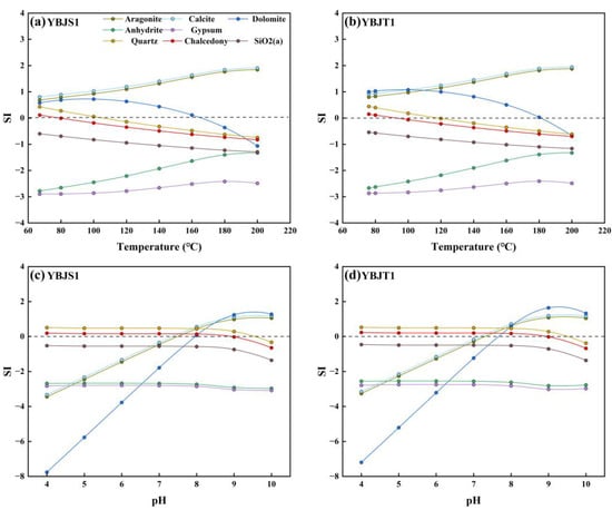 Scaling is one of the major problems in the utilization and production of geothermal fluids [62]. The change in hydrodynamic characteristics, gas partial pressure, and pH value will occur during the rising process of geothermal water, which will affect the change in scaling characteristics. In this research, the PHREEQC3.0 program was employed to model the alteration in equilibrium conditions of diverse minerals across a temperature range spanning from the wellhead temperature to 200 °C and the pH range of 4 to 10, respectively. Two samples, YBJS1 and YBJT1, were selected for simulation (Figure 14), because these two points had higher Ca2+ concentrations relative to the other samples (Table 1). Both samples exhibited supersaturation of aragonite and calcite across the entire temperature range (Figure 14a,b), indicating that intensive degassing of the geothermal water occurred during its ascent, resulting in a tendency for carbonate minerals to supersaturate and precipitate [6,10]. The carbonate minerals in the two samples gradually changed from an undersaturated state to a supersaturated state with the increase in the pH value (Figure 14c,d). This is because of the geothermal fluid flowing from the deep (high temperature and high pressure) to the shallow (low temperature and low pressure). During this transition, CO2 degassing and the boiling of geothermal water occur, resulting in an increase in pH. Consequently, this promotes the precipitation of carbonate minerals [10,63]. It might be inferred that the occurrence of CaCO3 scaling took place at a certain stage during the upward movement of geothermal water from the reservoir to the surface in the Yangbajing. Lei et al. analyzed the XRD of the scaling material from the wellheads of Yangbajing and concluded that the volume share of CaCO3 was more than 99% [52]. And by constructing a wellbore calcium carbonate scaling evaluation model, the maximum scaling rate of one well was simulated to be 0.067 mm/d, which occurred at a burial depth of 97.5 m.