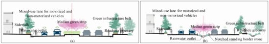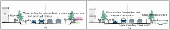 According to the design requirements for urban road engineering in China, it is evident that urban roads have different grades and corresponding service functions within the road network. According to the attributes of their traffic functions, they can be divided into expressways, main roads, secondary roads, and access roads. Additionally, based on the characteristics of the road cross-sectional forms, they can be categorized into different types such as single-carriageway, dual-carriageway, triple-carriageway, and quadruple-carriageway sections. The control guidelines in urban design must fully integrate the concept of sponge cities. Regardless of the road’s cross-sectional form, it is crucial to consider the spatial layout and design planning of both green and grey infrastructures comprehensively, utilizing different urban road spaces for stormwater management and control [34].