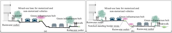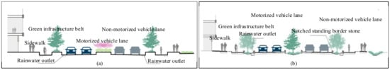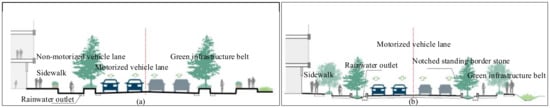 Traditionally, urban roads have around 75% of their area covered in impervious surfaces, with green belts constituting about 25%. The rate of permeable paving is less than 30%. Both curbstones and green belts are elevated 10–20 cm above the road surface. Storm drains are placed on lanes for motorized or non-motorized vehicles. Green belts can only receive stormwater from their own areas, and storm drains only collect surface runoff, making effective stormwater drainage difficult to achieve. This often results in water accumulation on road surfaces and, in extreme cases, even results in urban flooding [30].