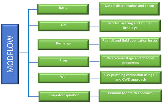 - Schmid, W.; Punthakey, J.; Hodgson, G.; Kirby, M.; Ahmad, M.; Podger, G.; Stewart, J.; Basharat, M.; Khero, Z.; Bodla, H. Development of a Regional Groundwater Model for the Indus Basin Irrigation System of Pakistan. South Asia Sustainable Development Investment Portfolio (SDIP) Project. CSIRO, Australia. 2017. Available online: https://www.researchgate.net/publication/321500430_Development_of_a_regional_groundwater_model_for_the_Indus_Basin_irrigation_system_of_Pakistan_Status_report (accessed on 15 December 2023).