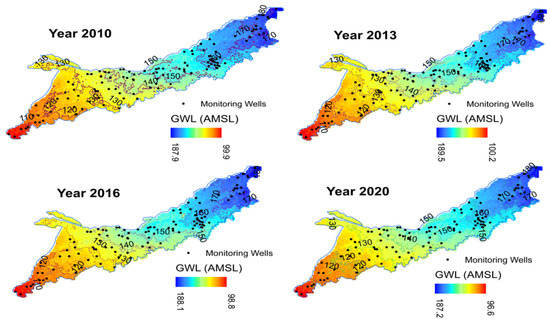 - Kaur, N.; Kaur, S.; Kaur, P.; Aggarwal, R. Impact of climate change on groundwater levels in Sirhind Canal Tract of Punjab, India. Groundw. Sustain. Dev. 2021, 15, 100670. [Google Scholar] [CrossRef]