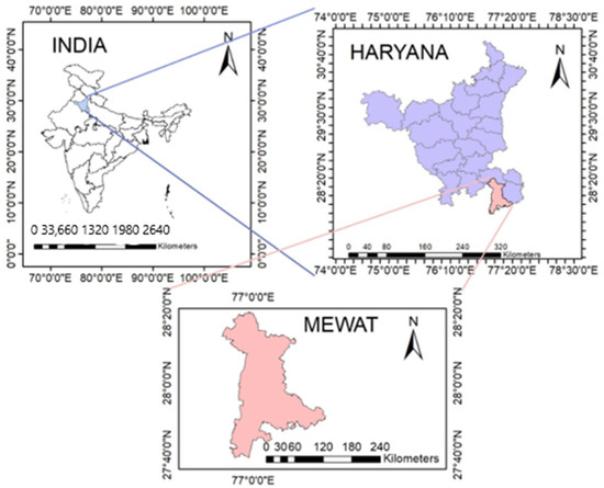 Mewat (Figure 1) is located in the northwestern part of India within Haryana state, covers an area of 1859.61 km2 and is the 16th largest district in the state. Its geographic coordinates are approximately 27°39′ to 28°20′ latitude, 76°51′ to 77°20′ E longitude, and an elevation of approximately 199 m above sea level. The district was cleft from the Gurgaon district and Hathin block of Faridabad district 4 April 2005. As per the 2011 census, the district has a population of 1,089,406 with a population density of 723 persons/km2, whereas the decennial growth rate is 37.93%. There are 443 villages in the district. In total, there 160,280 households in the district as per the 2011 census. The district touches administrative boundaries with the Gurgaon, Faridabad, Palwal, and Rewari districts of Haryana State. The Mewat district comprises five Tehsils, namely Nuh, Ferozepur jhirka, Punhana, Tauru and Nagina. There are seven administrative development blocks, namely Taoru, Nuh, Indri, Nagina, Pingwan, Punahana and Ferozepur Zirka.