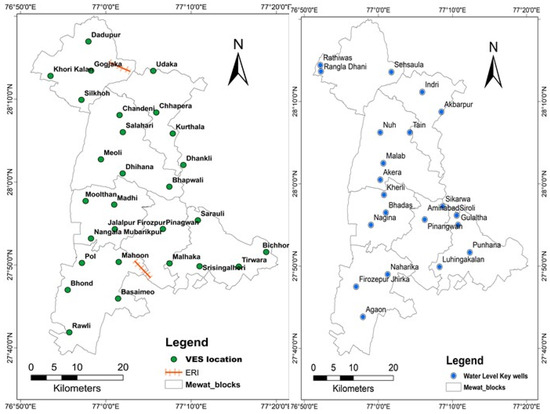 Location map showing VES conducted and water level wells in Mewat, Haryana.