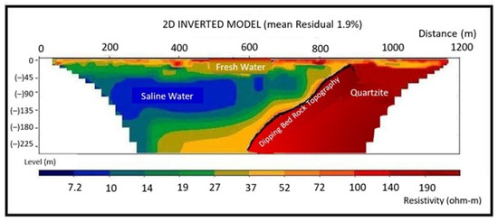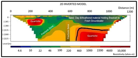 Resistivity values ranging between 11 and 35 ohm-m indicate the presence of clay in the topsoil. An increase in resistivity suggests that the topsoil has a low degree of saturation [21]. Typically, the thickness of this layer is approximately 12 m. Groundwater quality can be determined by resistivity values > 15 ohm-m indicating fresh groundwater, while < 15 ohm-m indicates saline to brackish quality water. The granular zones are composed of sand and kankar. Table 1 shows the general resistivity ranges of the inferred lithological predominance and groundwater quality.