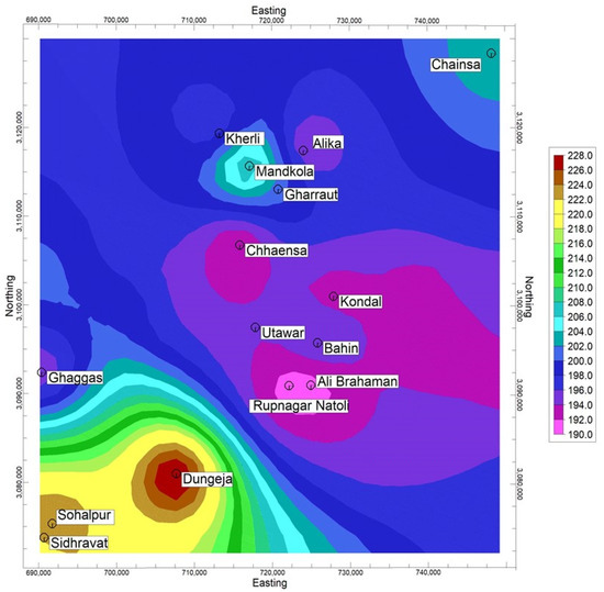 The groundwater potential of the district has been assessed as per GEC-2015 year 2022 [3,26]. The primary source of recharge in the area is rainfall. The net groundwater availability of the district is 18942.56 and the present net groundwater draft in the district is 13,936.29 mcm. The net groundwater availability of the district for future use is 4345.4 mcm, of which 1696.35 mcm is kept reserved for future domestic and industrial purposes. In Tauru block (123.79%) and Firozpur Jhirkha block (103.62%), which fall in the overexploited category, no further development of groundwater should be conducted (Figure 15, Figure 16, Figure 17 and Figure 18). Since a large area has shallow groundwater levels within 5.0 m, there is substantial potential recharge in the district. The details are provided in Table 3.