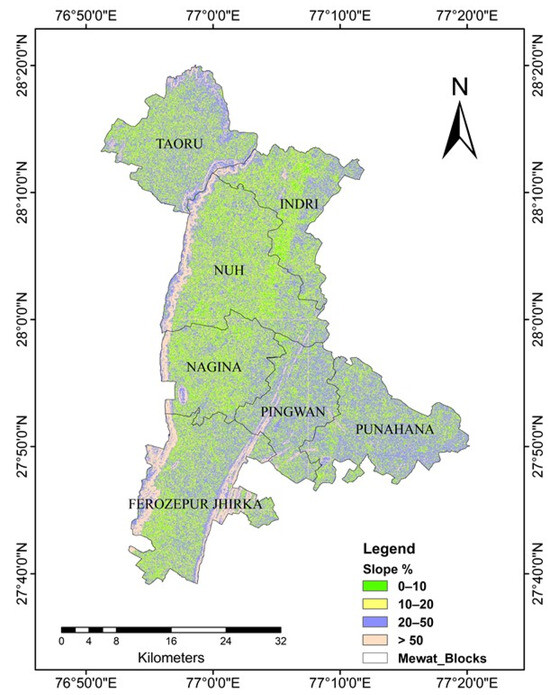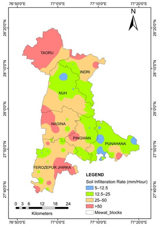 To determine tectonic influences, a digital elevation map and a slope map of the study area are shown in Figure 6 and Figure 7. Soil infiltration studies in the district have inferred that the water infiltration capacity of the soil initially ranges between 90 mm/h and 660 mm/h (Figure 8), whereas the final rate of infiltration in the district varies between 5 mm/h and 164 mm/h (Figure 9). The average rate of infiltration of the Mewat district is estimated to be 151 mm/h. The higher initial rate of water infiltration at a few sites indicates the presence of cracks and the sandy nature of local soil. With further water application, the infiltration rate started reducing quickly due to the presence of clay in the soil [24]. Due to the expansion of clay minerals, there is a reduction in pore spaces, which disturbs pore connectivity and decreases infiltration [25,26]. The low infiltration rates are also observed at a few sites, indicating poor percolation of excess water through the subsurface, which results in water logging and salinity in that area. The texture of the soil is loamy clay with a predominance of sand at a few places. The statistical power function yielded a coefficient of determination (r2) between 0.75 and 0.99 for the observed 67 infiltration rate data points (y, mm/h).