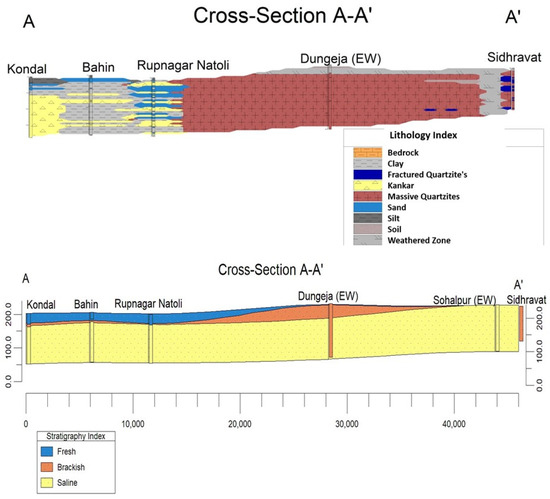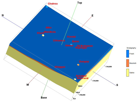 According to the VES data, freshwater can be found between the depths of 40 and 80 m in Langra, Dhulawat, Charora, Didhara, and Kankarka. However, in these areas, groundwater becomes saline beyond 80 m below ground level. In the northwest of the district, specifically at Patkhori, Patan-Udaipur, Kalbari, Tauru, Chahalka, Sarai, and Kankarka in the Touru Block, there is a possibility of finding freshwater at approximately 100 m deep. A geo-electrical section was prepared based on the VES carried out in the district, and it is shown in Figure 3.