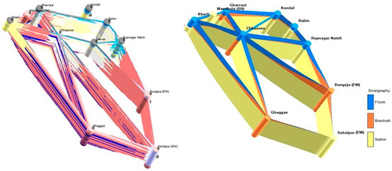 On the basis of lithology information gained, the 3D lithological model of Mewat district is prepared as shown along with its fence in Figure 12. The 3D disposition of aquifers based upon the chemical quality and geophysical data is prepared as shown in Figure 13 and Figure 14.