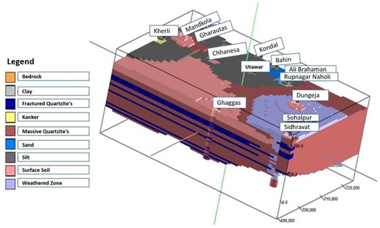 On the basis of available lithological exploration and geophysical data of the study area, a 3D hydrogeological model is generated by using the RockWorks version 15 software to understand the lithological framework and aquifer disposition of the district. The lithology data of exploration and observation wells drilled in house by the Central Groundwater Board [26,27], the Public Health and Engineering Department (PHED), and private agencies are integrated and optimized. A contour map is prepared based upon the difference in elevation of the optimized wells. The 2D cross-sections of lithology have been prepared. The three-dimensional lithological fence diagram provides a clear representation of subsurface lithology in space and has also been prepared using the lithology model and is discussed in the following section. The lithology and its geometry define the nature of aquifer formation in the region and thus provide the basic parameters for determining the occurrence and movement of groundwater.
