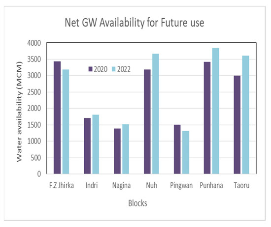 Comparison of net GW availability for future use in 2020 vs. 2022 in Mewat, Haryana.