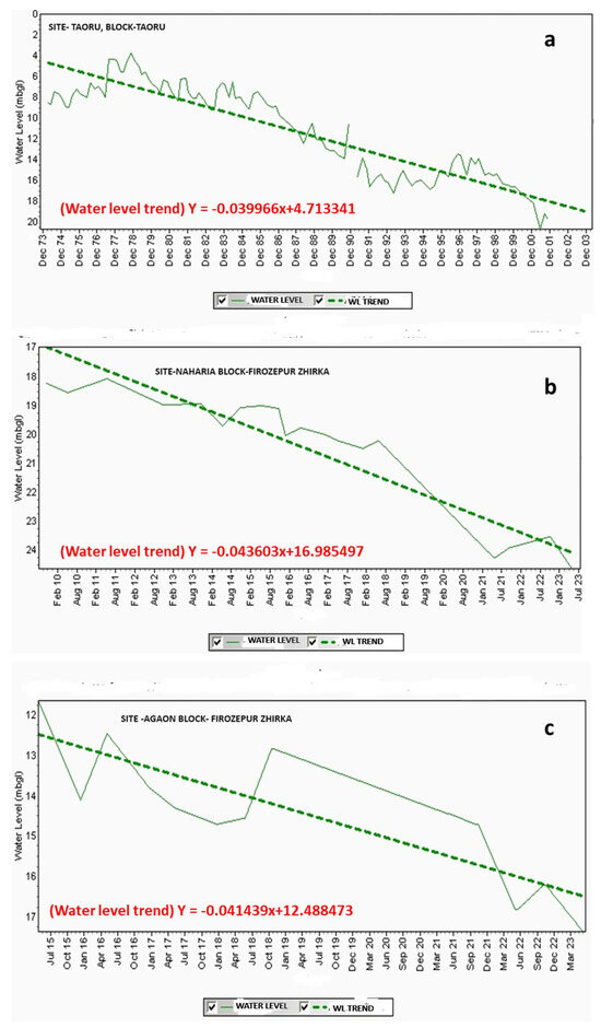 The Taoru and Ferozpur Jhirkha blocks have fresh groundwater that is regularly pumped for irrigation and drinking purposes. This results in the deepening of groundwater levels, causing these blocks to be categorized as overexploited due to the high demand for extraction in relation to rainfall recharge. Hydrographs depict the declining water level trend over the years in the district (Figure 19a–c). The phreatic aquifers are drying out due to declining water levels, leading to the failure of shallow tube wells and dug wells. In addition to groundwater depletion, deteriorating groundwater quality and rising water table/waterlogging [28] are also issues in the study area.