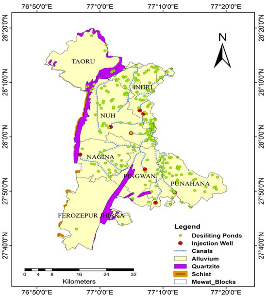 Groundwater resources across the planet can be utilized for various uses in domestic, industrial and agricultural sectors, and other developmental purposes. Groundwater acts as an important source of freshwater in various parts of India, catering to a number of vital purposes, such as irrigation and drinking water supply. Furthermore, it is a verified reality that India holds the title of being the world’s foremost consumer of groundwater [1], utilizing approximately 205 cubic kilometers of it annually [1]. In India, the surge in groundwater demand has risen significantly due to the rapid expansion of the population, industrialization, and urban development [2]. India relies extensively on groundwater across a multitude of sectors, with agriculture being the most crucial. Consequently, there is significant interconnection between groundwater and agriculture in India [3]. Agriculture plays a pivotal role in India’s economy, contributing approximately 15–20% to the national GDP. Agriculture has been a cornerstone of the country’s economic advancement and efforts to reduce poverty. Groundwater serves as a source of freshwater for more than fifty percent of the irrigated areas in India as well [4,5]. Nonetheless, the continuous use of polluted water for irrigation can lead to a decline in soil quality, rendering it less fertile or even unsuitable for agricultural purposes [6]. Approximately 200 districts spanning 19 Indian states exhibit groundwater pollution [7], encompassing issues such as elevated salinity levels [8], heavy metal presence [9], fluoride contamination [10], and arsenic contamination [11]. The Mewat district in the Indian state of Haryana is representative of a semi-arid area, where the annual precipitation typically falls within the range of 200–500 mm [12], with temporary lakes and a moderate level of groundwater found in alluvial aquifers, faces the problem of integral widely spread groundwater salinity problem [13,14,15,16]. The implementation of groundwater initiatives in regions with limited and unpredictable rainfall is a vital environmental factor to enhance agricultural productivity [3]. This study in Haryana’s Mewat district serves multiple significant purposes. There have been many studies conducted by various researchers on the salinity issues and the mechanisms involved in Mewat, Haryana and adjoining areas [13,14,15,16] but no work has been reported on geophysical investigations. Therefore, this study was carried out to address a need for a thorough hydrogeological evaluation and comprehension of aquifer distribution, interfaces between freshwater and saline water, and geological attributes. These insights are crucial for informed, sustainable water management. A primary outcome is identifying freshwater resources through meticulous aquifer mapping, empowering local communities and policymakers to manage water use effectively in the face of scarcity. The primary objective of this study is to offer essential data and insights for informed water resource management in Mewat, equipping decision makers to tackle unique water challenges and ensure long-term security.