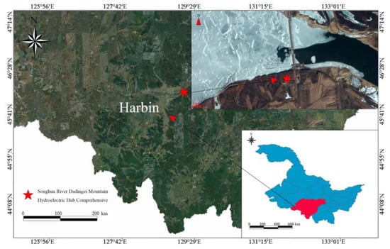 The experiment was carried out at the Songhua River Dadingzi Mountain Hydroelectric Hub Comprehensive Test Site in Harbin City, Heilongjiang Province, China, between 24 December 2022 and 12 February 2023. The site coordinates are 46°39′ N and 127°25′ E (location of the red star marker in Figure 1). For approximately 130 days of the year, the Harbin section of the Songhua River is frozen over [], and many snowfall events and extended periods of cold weather have led to the growth of local snow and ice sports, including skiing, cold-water fishing, winter fishing, and winter rallies. The thermal and physico-mechanical characteristics of snow are of guiding significance for the economic development of the area as well as the prevention and control of natural disasters because snow is a significant tourism resource in the region. A temperate monsoon environment with notable seasonal changes prevails in the research region. In the cold, dry winter, it is dominated by temperate continental air masses, and in the hot, humid summer, it is dominated by temperate oceanic air masses or modified tropical oceanic air masses. The average temperature over the course of the year is 4.3 °C, with the average temperature in January being approximately −18.3 °C and the average wind speed being approximately 2.8 m/s. The average temperature and wind speed in February are approximately −14 °C and 3.0 m/s, respectively. The snowfall season is centralized from November to January. During this period, the greatest snow depth is approximately 41 cm, with an average precipitation (snowfall) of 23.6 mm [].