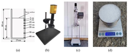 Snow temperature field observations were performed using temperature sensors for platinum resistance temperature sensors (accuracy of ±0.1 °C), while snow depth was measured using an ultrasonic ranging sensor (SR50A type (Campbell, Logan, UT, USA)) (accuracy of ±1 cm), both of which used a data acquisition instrument (Campbell CR3000 type(Campbell, Logan, UT, USA)) to collect data. The temperature chain layout is shown in Figure 2a. A JT-H6 industrial microscope(Jingtuo Youcheng Co., Ltd., Shenzhen, China) was used to observe the snow crystal microstructure, as illustrated in Figure 2b. The magnifying range of the microscope ranged from 0.7 to 4, and calibration was necessary to establish the scale before viewing. A dynamic resistive strain gauge (YD-28A type(East China Electronic Instrument Factory, Shanghai, China)) was used to connect an electronically controlled penetrometer [] to the acquisition equipment (VK701H+(Weijingyi Electronics Co., Ltd, Shenzhen, China)), as illustrated in Figure 2c, to measure the hardness of the metamorphic snow. Figure 2d illustrates how the ring knife approach was used to sample the whole snowpack to determine the snowpack density.