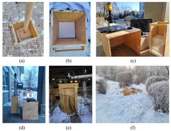 Drawing upon previous research and with the aim of facilitating a closer examination of the microstructure of snow crystals, snow was collected from the same snowfall, and its density was established at 200 kg/m3. The prepared snow samples were compacted layer by layer in a detachable wooden test box, which had a cross-sectional area of 25 × 25 cm and a height of 60 cm. To ensure the maximum possible initial uniformity of internal density in the snow samples, each layer was 10 cm thick. The initial internal density of the snow specimens was preserved as uniformly as possible through layered compression. Snow samples that received solar radiation were placed in an open, unobstructed area for natural metamorphism, whereas snow samples without solar radiation were placed on the shaded side of the building and covered with a shading canvas to ensure they were not influenced by solar radiation.