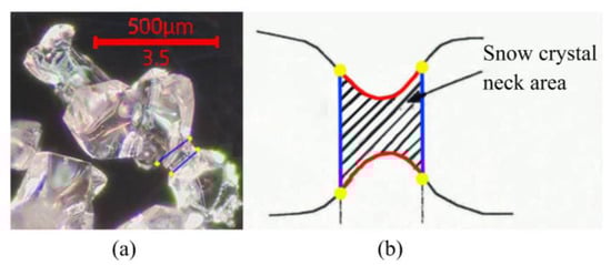 For each test, photographs of the snow crystals were taken in accordance with the four-layer stratification that occurred during compaction. When processing the photographs, preference was given to clearer photographs. An industrial microscope magnification scale was used to measure the actual area, circumference, and equivalent diameter of the neck region in the photographs. To ensure the accuracy of neck region selection, overlapping and mixed snow crystals were avoided, and necks with high resolution and obvious features were chosen. The method of selecting the neck area relied on manual identification and extraction. First, the area where two ice crystals were connected was found, and the four inflection points where the edge profile of the ice crystal changed from convex to concave were identified, i.e., the four points where the curvature of the edge profile of snow crystals with positive and negative signs changed (e.g., the four yellow dots in Figure 4b). Afterwards, the two inflection points between different ice crystals were connected by smooth curves along the outer contour of the ice crystals (e.g., two red curves in Figure 4b), and the two inflection points of the same ice crystal were connected by straight lines (e.g., two blue straight lines in Figure 4b). The closed area formed by the two curves and two straight lines was the neck area needed for this test, and finally, the area, perimeter, and equivalent diameter of the box selected were calculated using image processing software. During calibration, the pixels occupied by the scale bar were marked as the corresponding actual length, and then the actual length and area of the selected area could be determined. Although errors in manual recognition are unavoidable, the change in neck area caused by incorrectly identifying the inflection point was much smaller than the total neck area, and the technique of calculating the average value by counting many different neck areas was also effective in minimizing the error.
