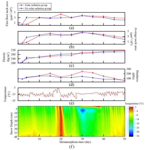 Changes in physical quantities over time during the experiment (a) neck area of the first layer of snow; (b) average neck area of snow; (c) density of snow; (d) hardness of snow; (e) temperature; (f) snow profile temperature of solar radiation group samples.