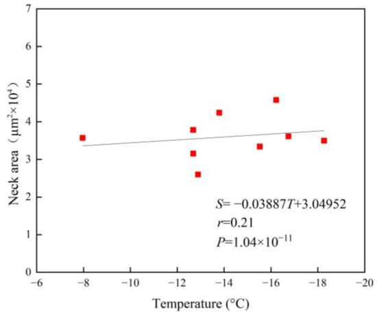 Due to the snow layer’s strong insulation properties and low thermal conductivity, there is a temperature differential between the snow layer and the surrounding air. As a result, the snow crystal neck area’s response to changes in air temperature lags slightly. Temperature is still one of the most significant factors influencing snow metamorphosis, despite the low correlation coefficient between the change in neck area and air temperature during snow metamorphosis. Lehning [] considered grain growth and cross-layer mass transport as two distinct processes, with temperature serving as a crucial physical parameter that influences the transport of vapor fluxes within the snowpack, which has the potential to induce the transportation of water vapor, resulting in significant localized sublimation and precipitation within the snowpack. The growth of ice particles is a result of vapor diffusion among them, caused by the temperature gradient applied to the snow cover []. Furthermore, recrystallization leads to the formation of ice crystals, the strength of which is significantly influenced by temperature []. The impact of the snowpack’s internal temperature on the neck region will be further examined in Section 3.2.4.