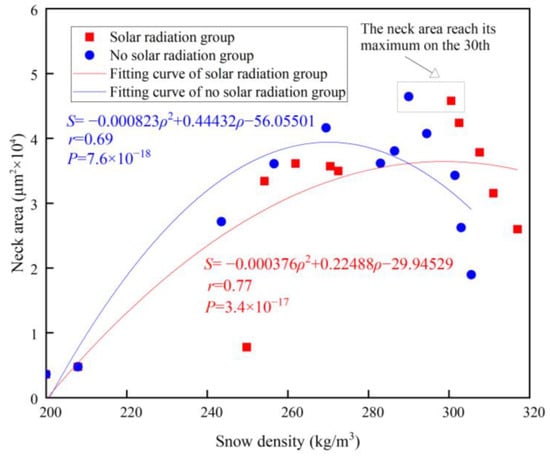 The curves of the snow crystal neck area relative to the air temperature for the solar radiation group are shown below, which combine the average neck area and air temperature during metamorphism in Figure 5b,e. The fitted curves are presented in Figure 6. Since the power metamorphism at the start of the fresh snow metamorphism is significantly larger than the temperature metamorphism, the fine snow whose metamorphism was carried out for up to ten days and beyond was selected for the statistics. Figure 6 shows that although the temperature and the neck are are adversely associated, the relationship is not particularly significant.
