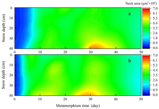 Changes in the neck area of snow crystals at different depths over time. (a) Changes in the neck area of snow crystals at different depths under solar radiation; (b) changes in neck area of snow crystals at different depths without solar radiation over time.