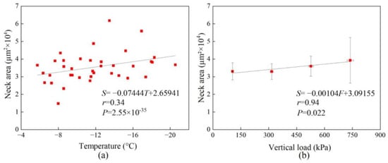 Figure 9a was created by plotting the temperature of the snow layer against the neck area of the snow crystals as they were measured in stages. The vertical snow pressure on the snow crystals in each layer was derived from the density and was used to determine the snow thickness using the snow layer settlement data collected by the ultrasonic range sensor. The four points from left to right in Figure 9b represent the average of the four layers of snow crystals in the snow box from the surface to the bottom at all metamorphic times. The points in Figure 9a cover the temperature and neck area of each layer during metamorphism, and since the snow layer temperature always varies with air temperature during metamorphism, the points are more discrete along the transverse axis and cannot be fitted after averaging the layers. The change in vertical load due to metamorphism is much smaller than the difference between snow layers, and so it can be calculated by averaging each snow layer. On the other hand, Figure 9b divides the changes in vertical load and neck area during metamorphosis of the four-layer snow specimens into four points after averaging and plots the error lines due to the changes in neck area and vertical load due to metamorphosis. The correlation in Figure 9a is better than the correlation of temperature in the neck area in Figure 6, and the snow profile temperature better reflects the effect on the neck area after accounting for the thermal conductivity of snow. However, the temperature is still less effective in describing the neck area, mainly because the effect of temperature on the neck of snow crystals is not an instantaneous process, and the description by the average value of the temperature does not fully reflect the metamorphic effect caused by vapor diffusion. Overall, the snow crystal neck area increases with snow depth, and the increase in vertical pressure contributes to the rise in the snow crystal neck area.